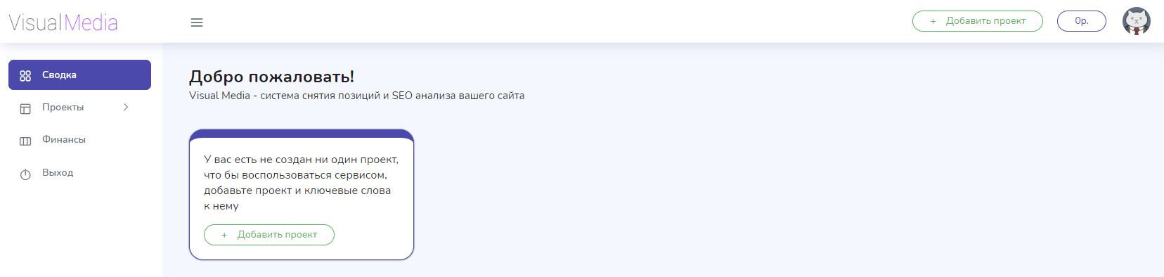 После авторизации вы попадаете в свой личный кабинет, где вы сможете создать проект и пополнить свой баланс.